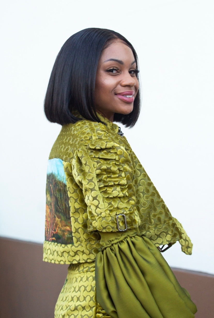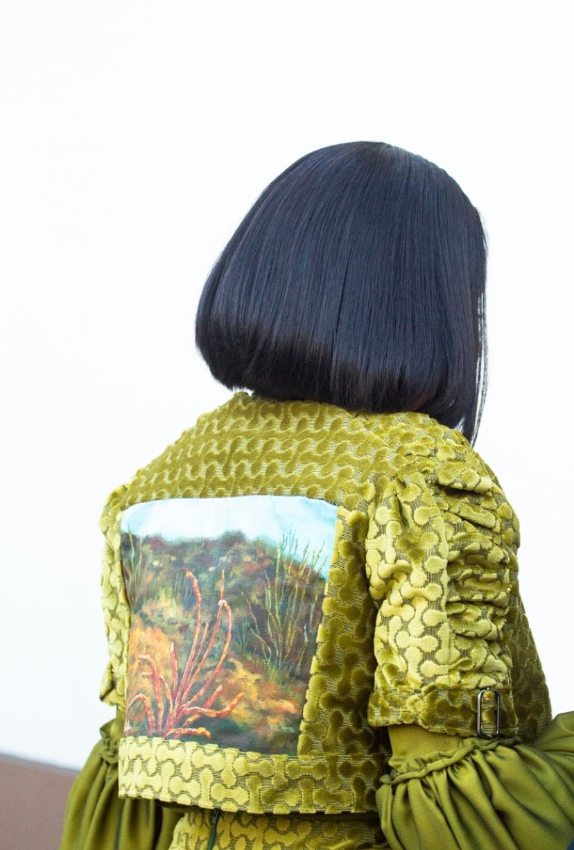 Green Silk Velvet Jumpsuit & Jacket Set- Flores del Desierto LAFW